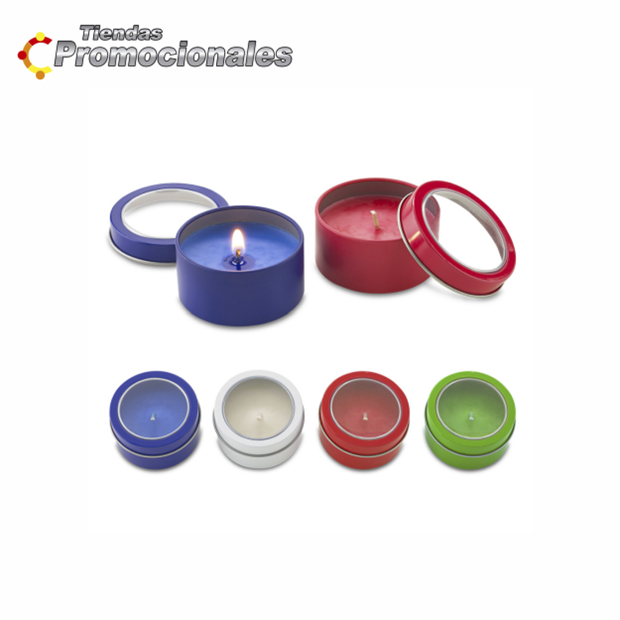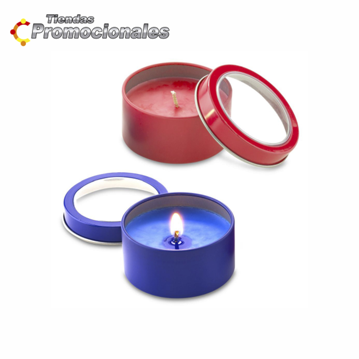 Estuche en hojalata importado, vela producción nacional. Medidas: 3 cm x 5,5 cm diámetro Marca: 3 cm / Tampografía