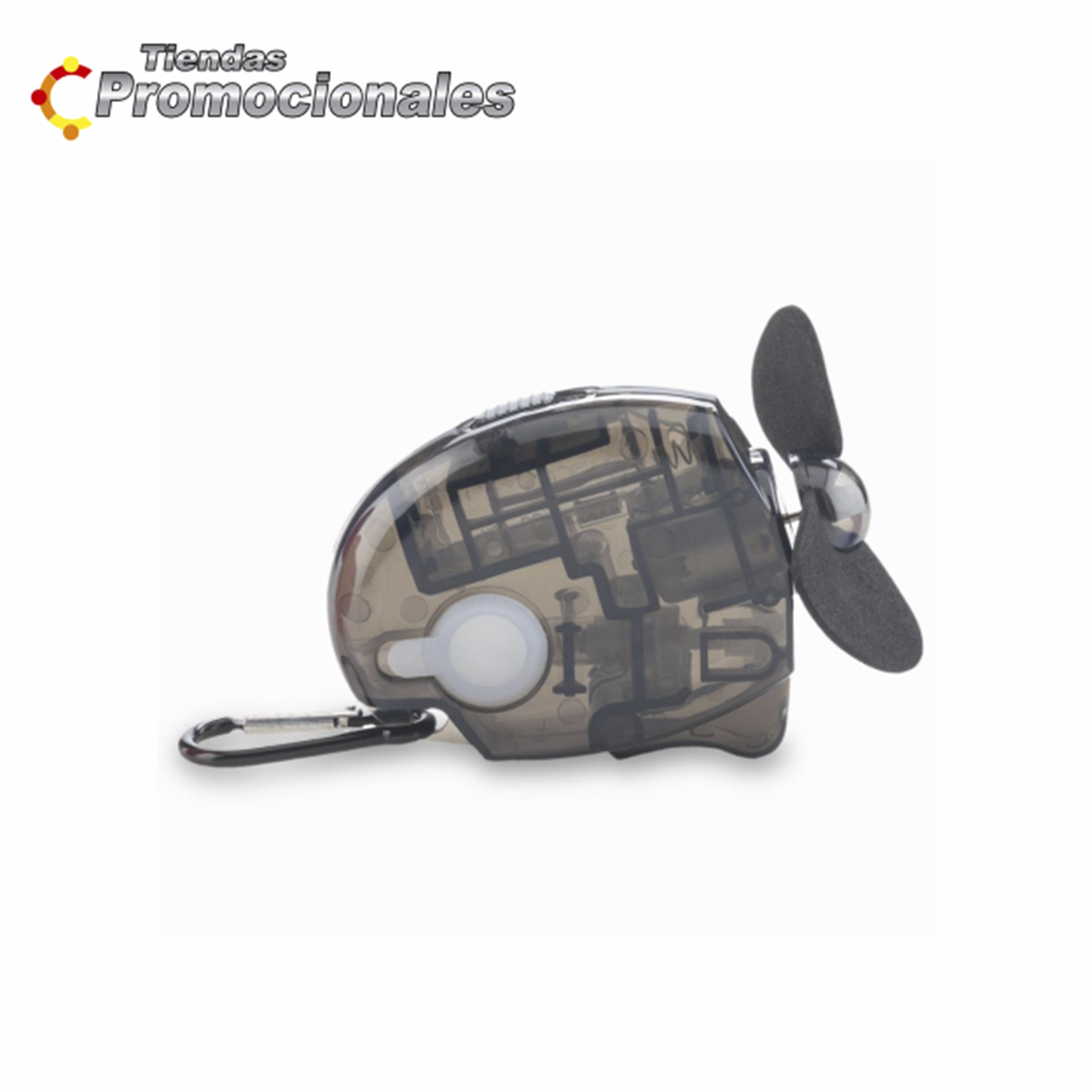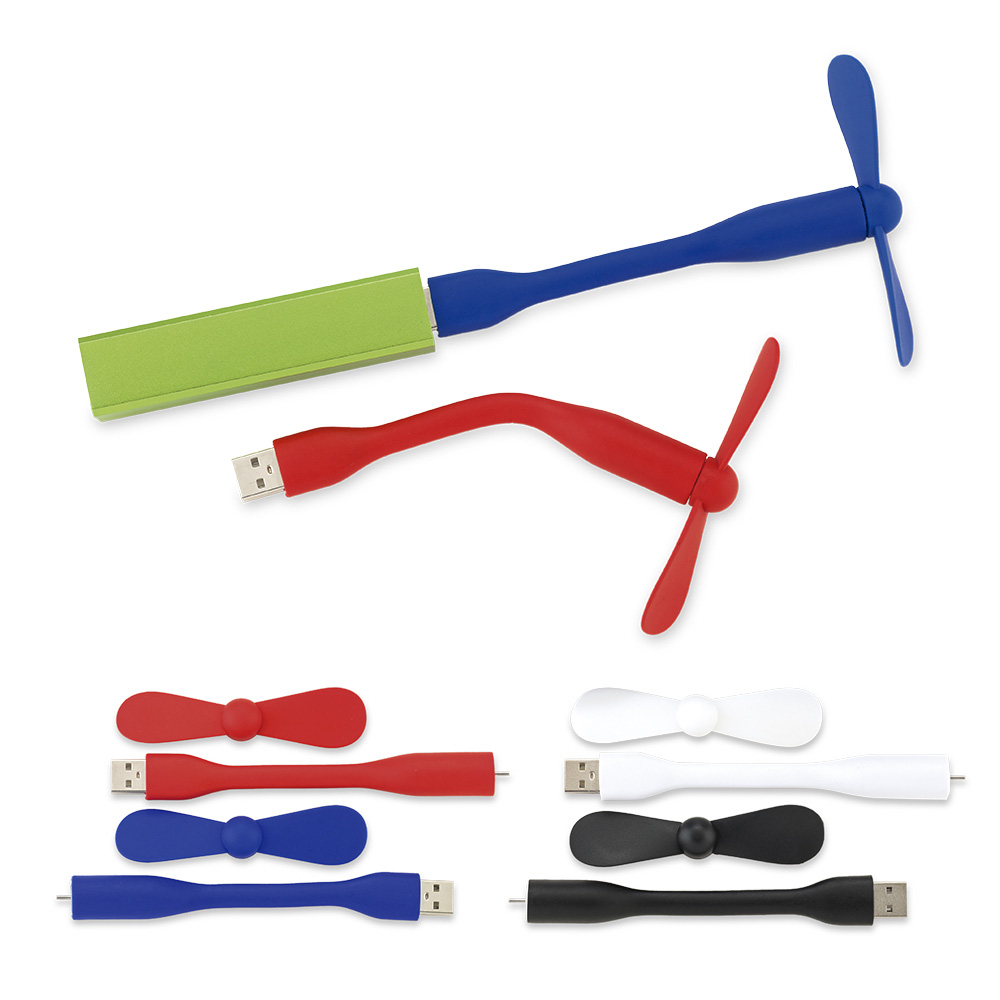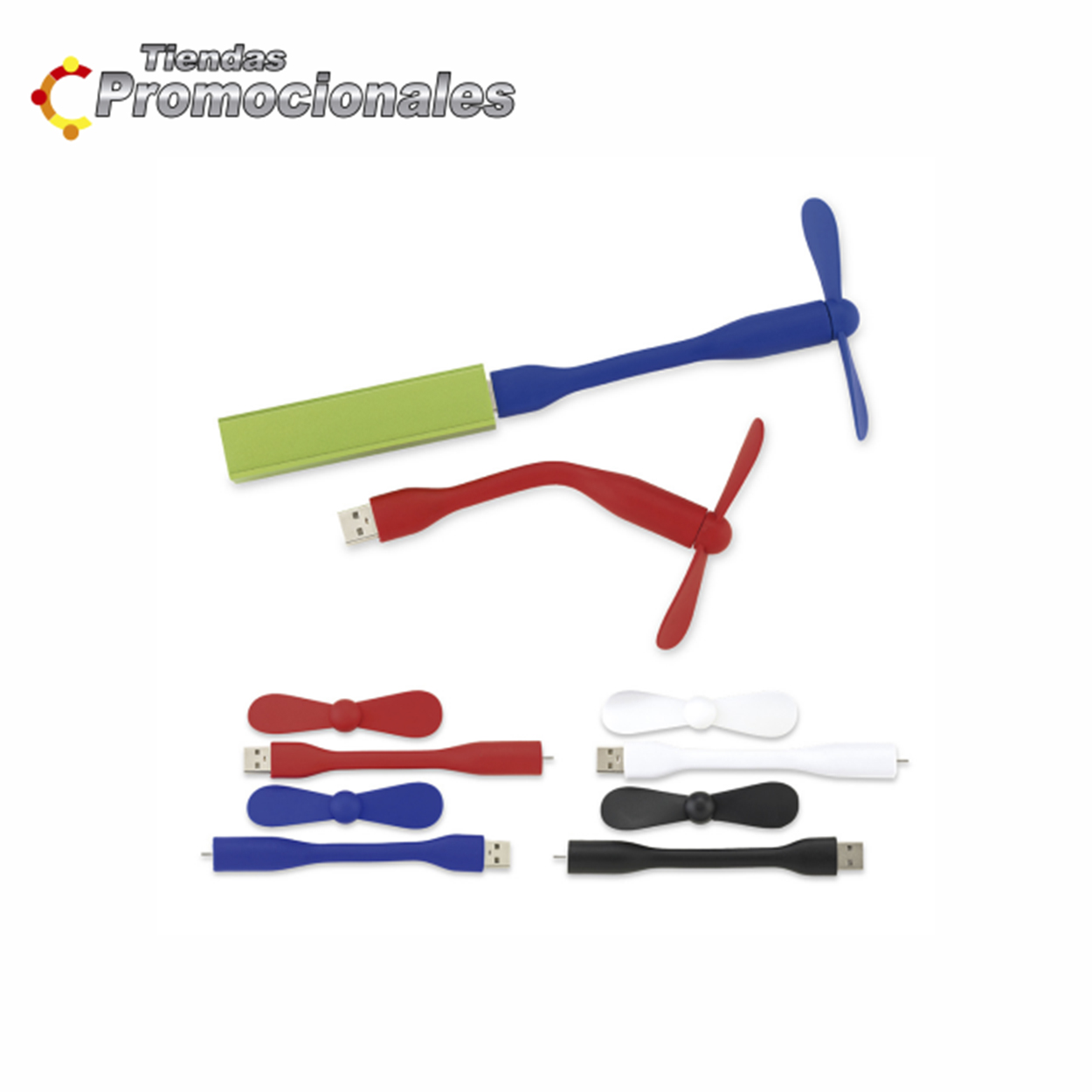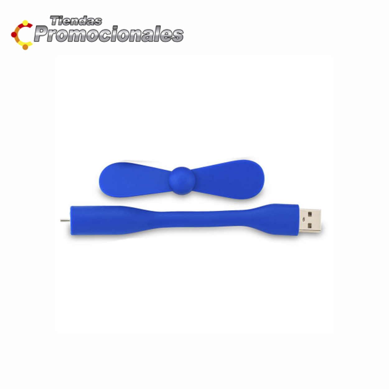 Ventilador USB flexible de 2 aspas. Funciona con pilas recargables (Powerbank) y productos con entrada USB. Medidas: 14.5 cm x 9 cm Marca: 3 cm / Tampografía