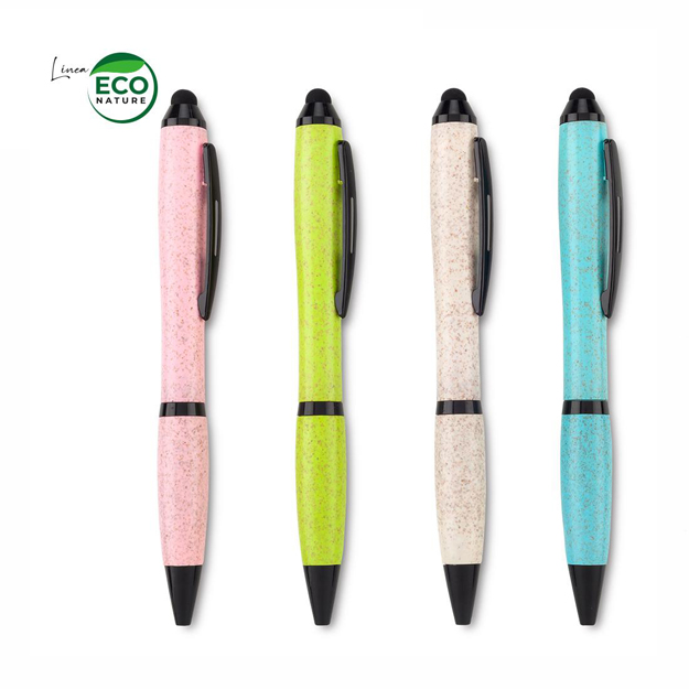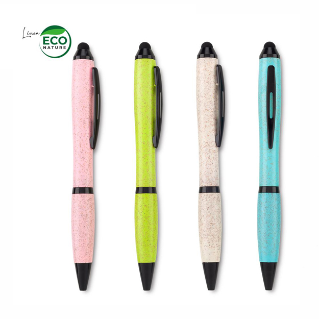Bolígrafo plástico con stylus. Clip metálico. Mecanismo twist. Mezcla con material ecológico en fibra de trigo (50%-60% aprox). El porcentaje de material ecológico tiene un promedio de biodegradabilidad de 2-3 años después del fin de su vida útil. Medidas:13.5 cm Marca:2.5 cm/Tampografía **Para el material con contenido de fibra de trigo puede haber variación en el tono de los colores debido a la reacción del tipo de material y los colorantes usados en la fabricación**