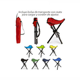 Silla plegable de 3 patas, incluye bolsa de transporte con reata para cargar y cordón de ajustar. Capacidad: Soporta hasta 80 Kg de peso.- MATERIAL: Poliéster 600D 100% con recubrimiento de PVC. Bolsa de transporte en Poliéster 210D 100%.