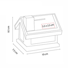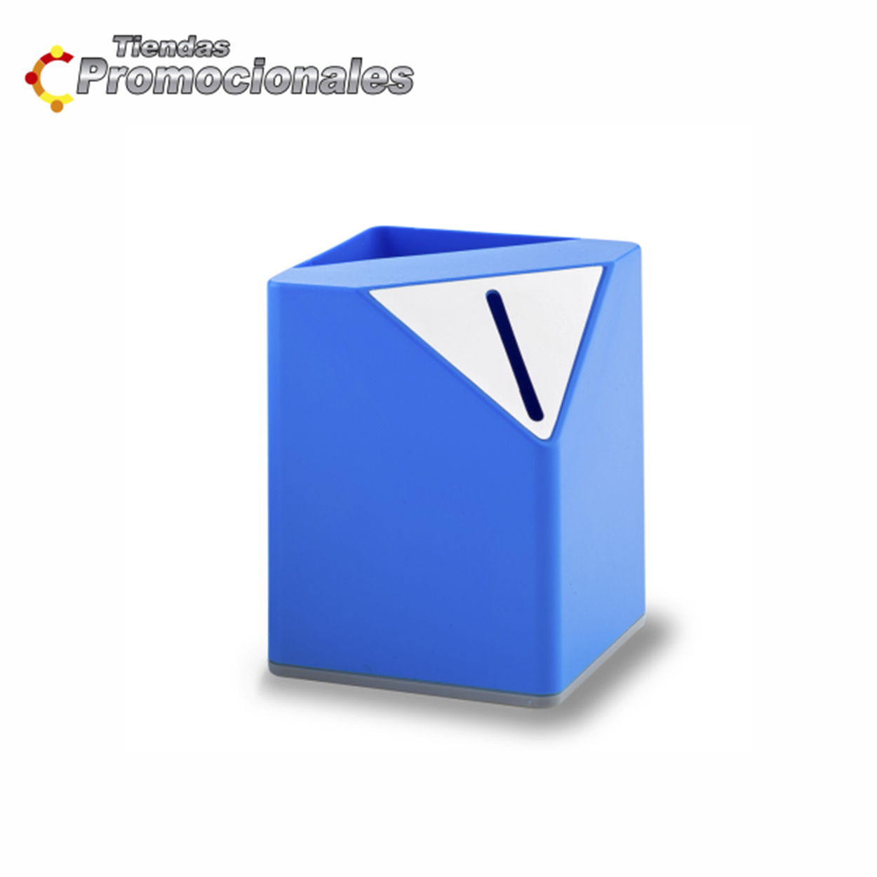 Alcancía plástica con portabolígrafo. Tapa giratoria en la base. No incluye bolígrafos.
